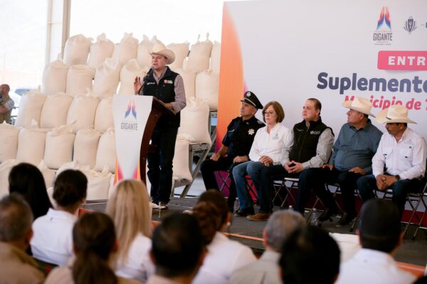 Tamazula, Dgo.– Con alimento de alta calidad para el ganado, que permitirá mantener la producción y enfrentar la temporada complicada, el gobernador del estado, Esteban Villegas Villarreal, encabezó en Tamazula la entrega de 30 toneladas de suplemento alimenticio, acompañado del presidente municipal, Ricardo Ochoa Beltrán, como parte de su gira de trabajo por los 39…