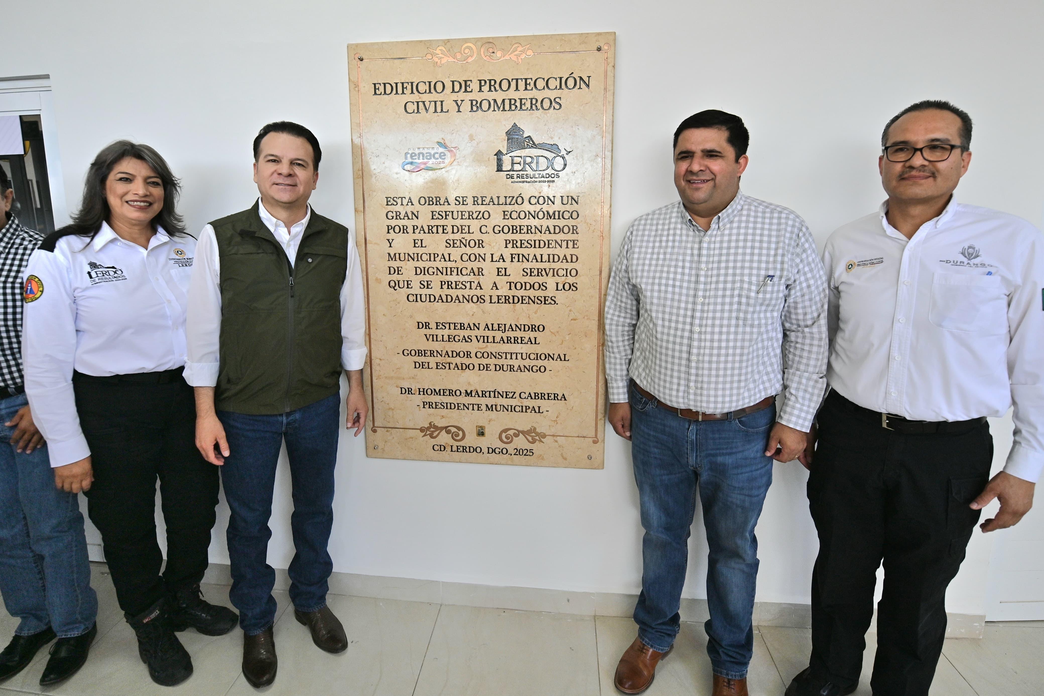 Lerdo, Durango.– Con instalaciones modernas, seguras y totalmente equipadas, las familias de Lerdo cuentan ya con una nueva Estación de Bomberos y Protección Civil, lo que representa un avance significativo en la capacidad de respuesta ante emergencias, además de dignificar la labor de quienes diariamente protegen a la población. Esta obra, entregada por el gobernador Esteban Villegas Villarreal y el presidente municipal Homero Martínez Cabrera, fortalece la seguridad pública, mejora la calidad de vida de toda la comunidad y requirió una inversión superior a los ocho millones de pesos.