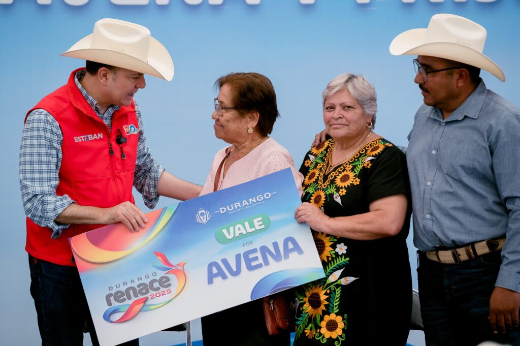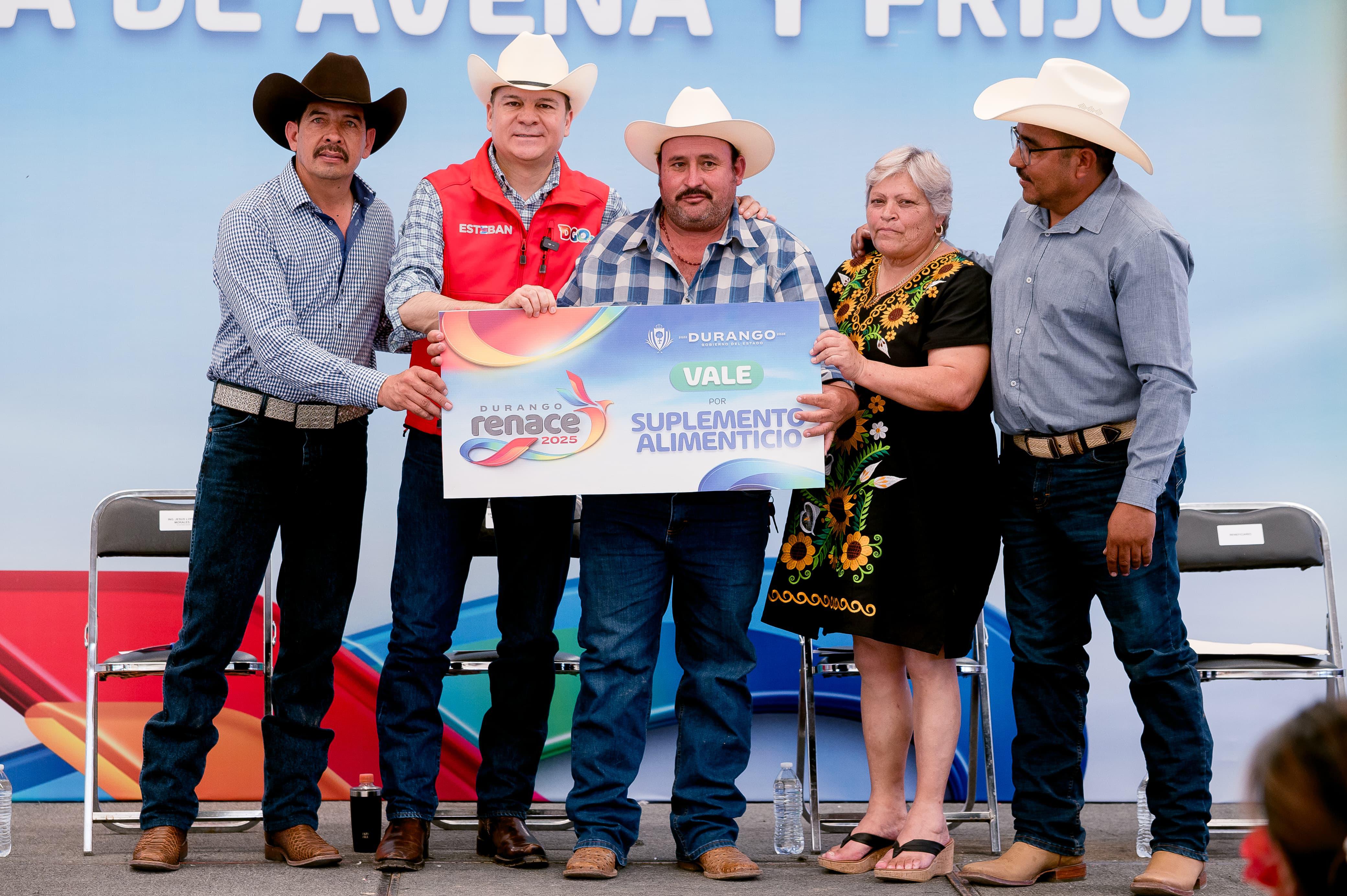 Peñón Blanco, Dgo.– Para impulsar la producción agrícola y ganadera durante la temporada de lluvias, el gobernador Esteban Villegas Villarreal entregó 80 toneladas de suplemento alimenticio, 60 de semilla de avena y 50 de frijol a productores de Peñón Blanco. Acompañado por la presidenta municipal Rita Lozano Reyes, destacó que estos apoyos son parte del compromiso de su gobierno con el campo duranguense, a través de acciones concretas, útiles y cercanas a la gente.