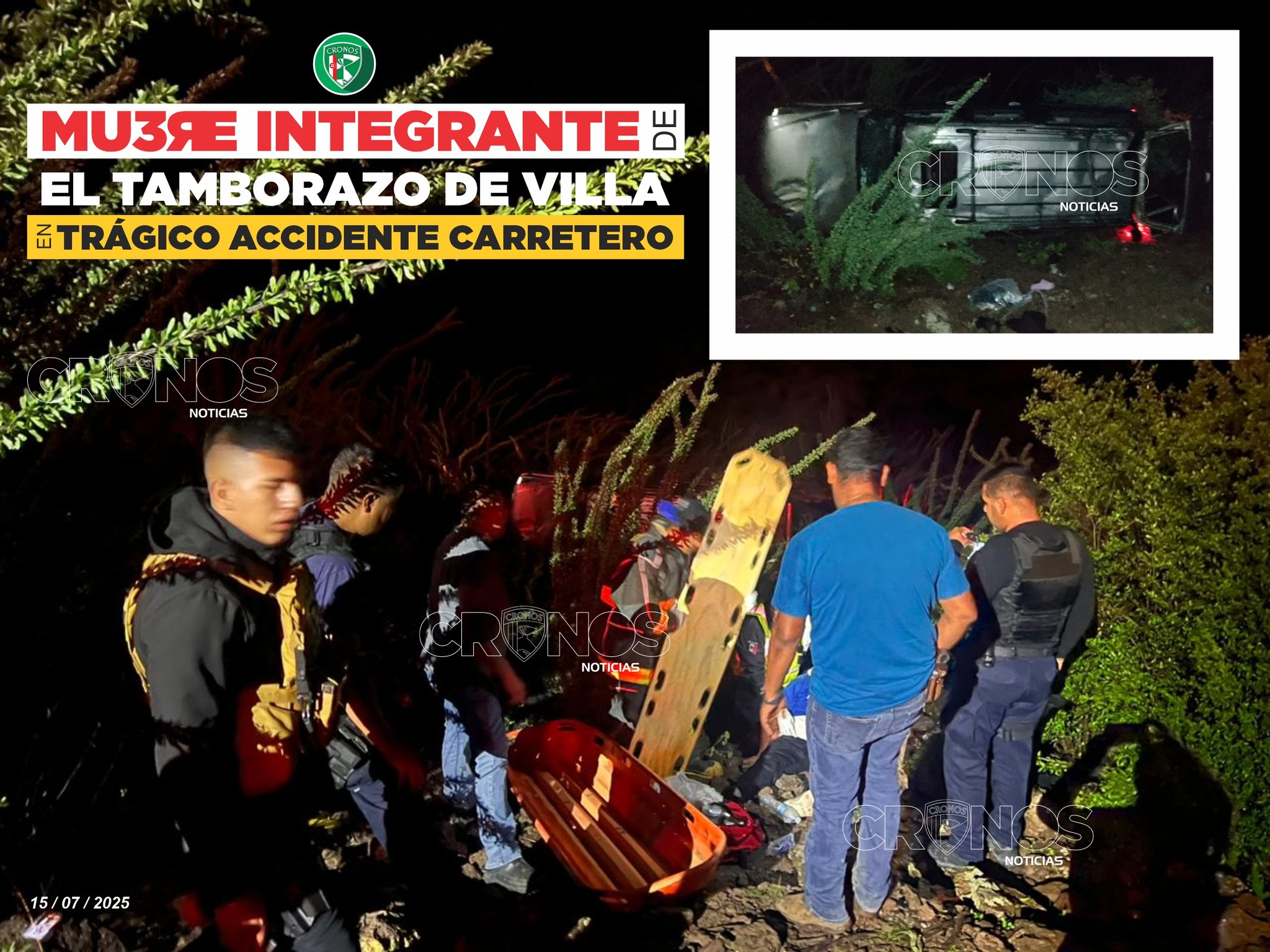 SAN JUAN DEL RÍO, DGO..- La madrugada de este martes, Aproximadamente a la 1:20 a.m., se tiñó de luto para el gremio musical del estado y la Región de los Llanos, luego de que un fatal accidente automovilístico cobrara la vida de un integrante del grupo “El Tamborazo de Villa” y dejara al menos seis personas más heridas. La agrupación regresaba de una presentación en el municipio de San Juan del Río, Dgo. cuando la camioneta en la que viajaban se precipitó a un barranco de aproximadamente 15 metros de profundidad.