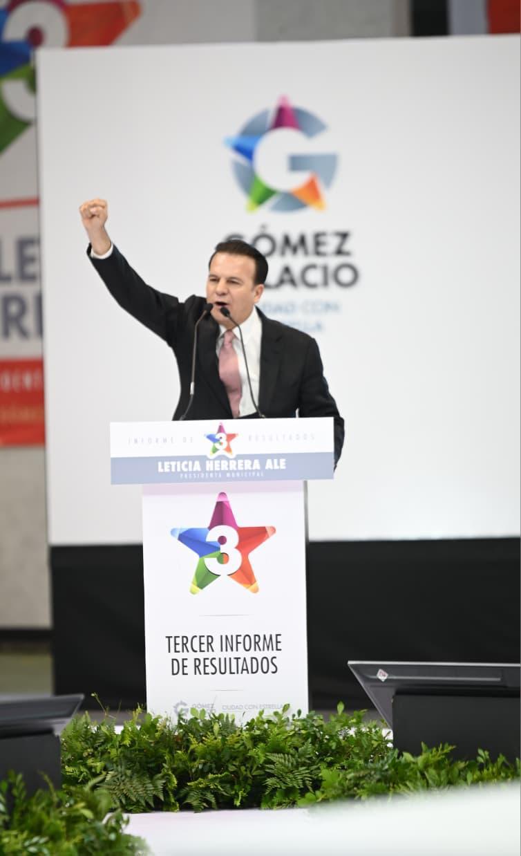 Gómez Palacio, Dgo.– Con un llamado a la unidad y al reconocimiento de resultados, el gobernador Esteban Villegas Villarreal encabezó el Tercer Informe de Gobierno de Leticia Herrera Ale, a quien destacó como una de las presidentas municipales que enfrentó mayores retos en Durango y que, pese a las dificultades, logró que Gómez Palacio se consolidara como un municipio con estrella, brillando en infraestructura, seguridad, desarrollo social y servicios públicos, además de inaugurar obras emblemáticas como el Auditorio Centenario.