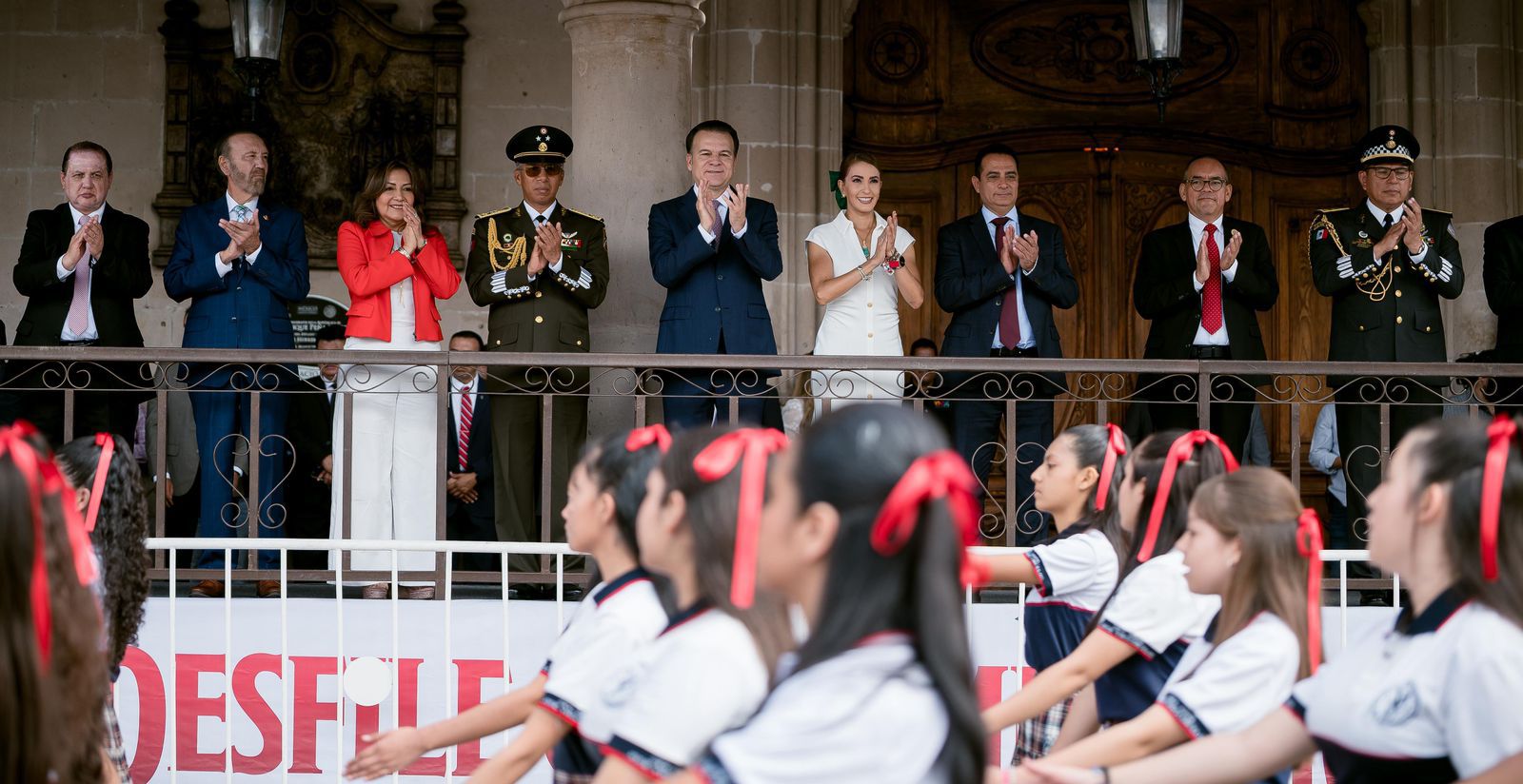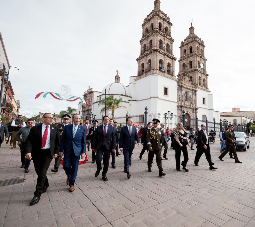 Posteriormente, los asistentes caminaron hasta la Plaza IV Centenario, donde el gobernador acompañado de autoridades de los tres niveles de gobierno, recibió a los contingentes frente a los Arcos del Museo Francisco Villa para dar inicio al desfile cívico-militar. Entre las autoridades presentes estuvieron el General de Brigada Salvador Alvarado Ramírez, el alcalde Toño Ochoa, el diputado Ernesto Alanís Herrera, presidente de la Junta de Gobierno y Coordinación Política del Congreso del Estado; el magistrado Manuel Valadez Díaz, presidente del Tribunal Superior de Justicia; el secretario general de Gobierno Héctor Vela Valenzuela y el brigadier Pedro Alberto Hernández Gallardo, coordinador estatal de la Guardia Nacional.