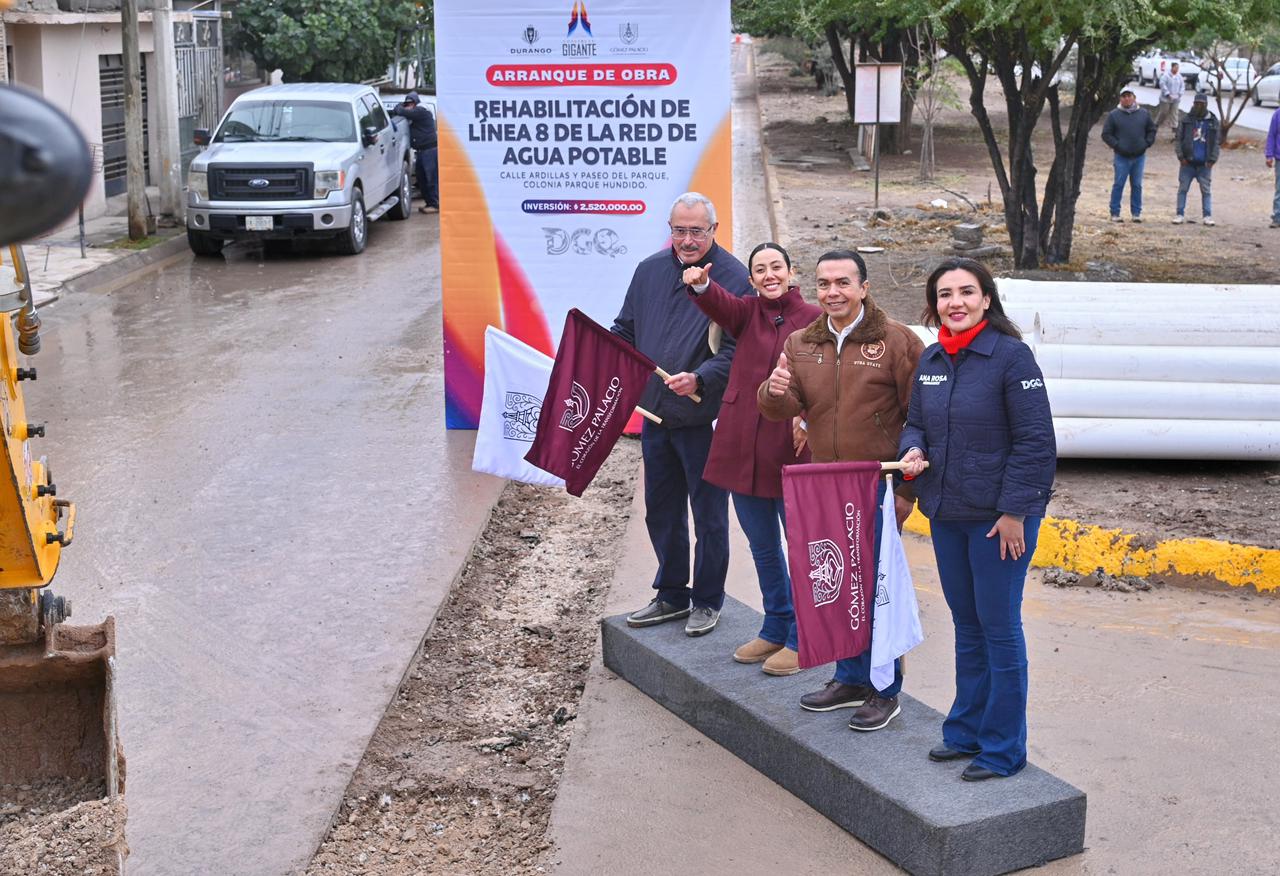 Gómez Palacio, Durango.– Con el arranque de la obra de rehabilitación de la línea 8 de la red de agua potable, el Gobierno del Estado y el Ayuntamiento de Gómez Palacio iniciaron trabajos en las calles Ardillas y Paseo del Parque, en la colonia Parque Hundido, con una inversión de 2 millones 524 mil 150 pesos, con el objetivo de mejorar el servicio de agua para las familias de la zona.