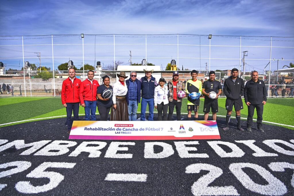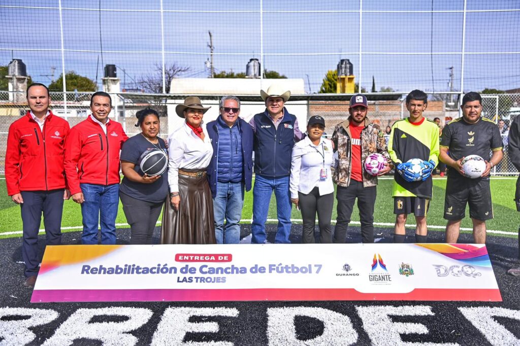 Nombre de Dios, Dgo.– Hoy las familias del fraccionamiento Las Trojes cuentan con una cancha de futbol 7 completamente renovada, segura y lista para usarse, la cual fue entregada por el gobernador Esteban Villegas Villarreal, junto a la presidenta municipal Nancy Vázquez Luna, como un espacio deportivo que permitirá a niñas, niños y jóvenes entrenar, jugar y convivir en mejores condiciones.