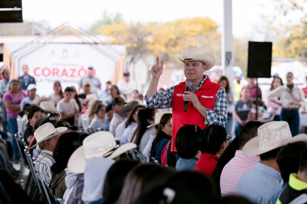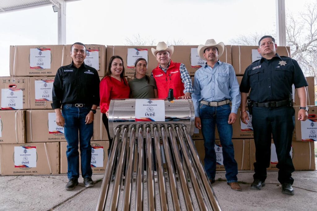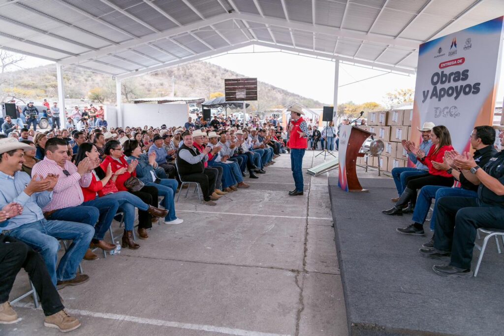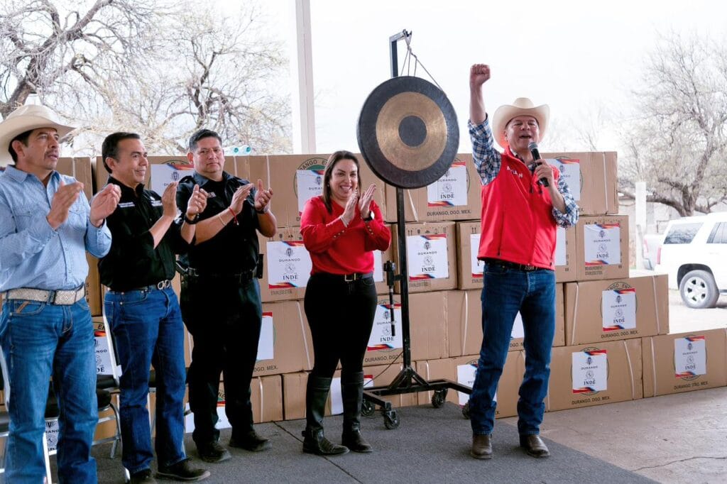 El Vetarrón, Indé, Dgo.– Más seguridad y apoyos para mejorar la vida de las familias en las comunidades de Indé con la entrega de una patrulla equipada, vehículo para transporte escolar, apoyos invernales, techumbres y calentadores solares, acciones que ayudan a reforzar la vigilancia y generar ahorro en los hogares. El gobernador Esteban Villegas Villarreal encabezó el encuentro realizado en la localidad de El Vetarrón, acompañado por la presidenta municipal Lorena Lucero Bustamante. Antes, el mandatario visitó los municipios de Hidalgo y Ocampo como parte de su recorrido por la región norte del estado.