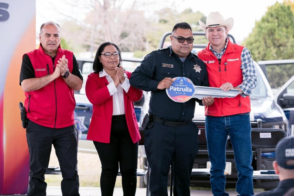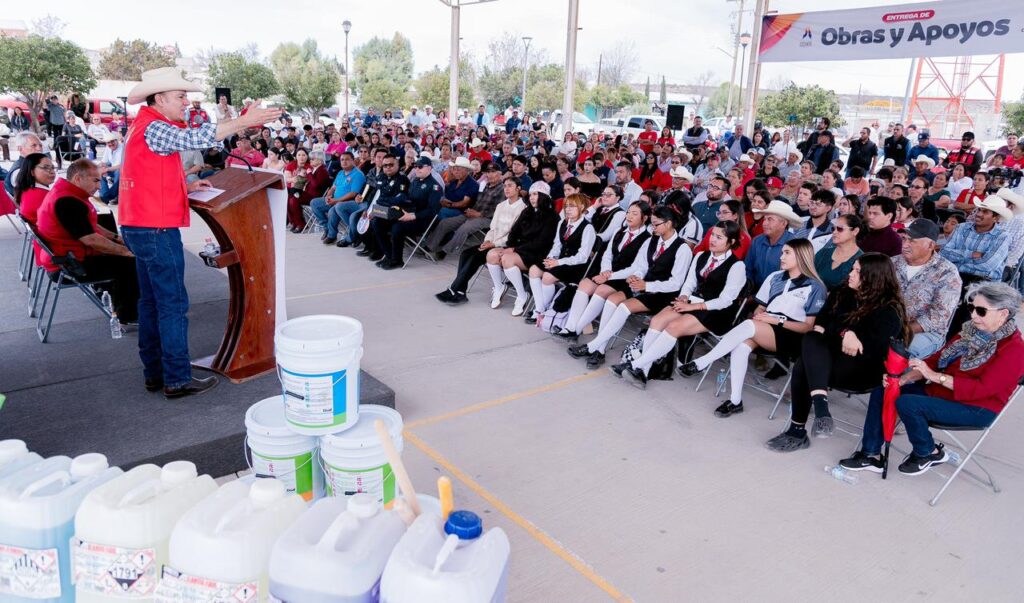 Hidalgo, Dgo.– Como parte de la gira de trabajo por los municipios del norte del estado, el gobernador Esteban Villegas Villarreal llevó obras y apoyos para atender necesidades de las familias de Hidalgo. Acompañado por la presidenta municipal Rocío Ávila Hernández, y con una inversión de 7.5 millones de pesos, entregó una patrulla y uniformes para la corporación policial, paquetes de limpieza y pintura para 13 escuelas y tres bibliotecas, además de apoyos invernales para familias de diversas comunidades.