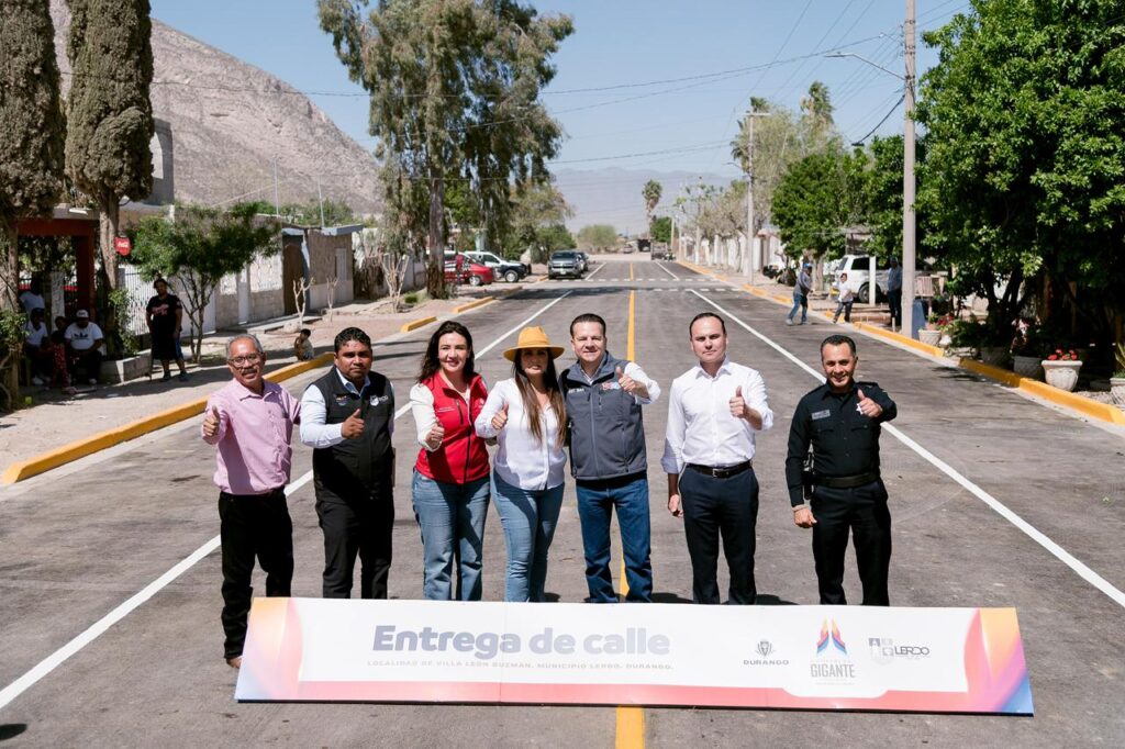 Villa León Guzmán, Lerdo, Dgo.– Con obras y apoyos que mejoran la imagen de la villa, fortalecen la seguridad y brindan mejores servicios a las familias, el gobernador Esteban Villegas Villarreal y la presidenta municipal Susy Torrecillas entregaron en Villa León Guzmán la pavimentación asfáltica de la calle Luciano López, una patrulla, equipamiento para Seguridad Pública y luminarias, como parte del trabajo conjunto que realizan el Gobierno del Estado y el municipio de Lerdo.