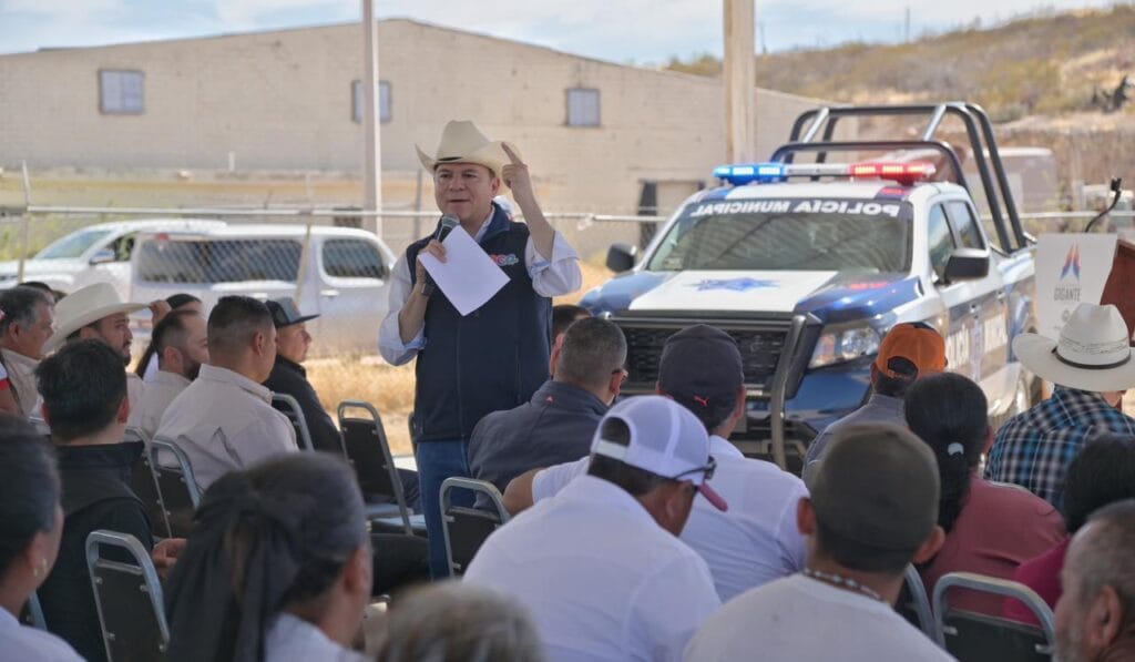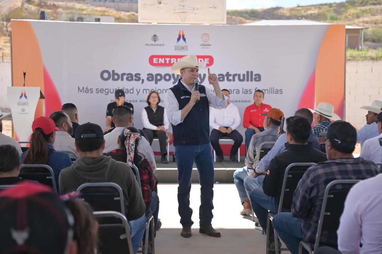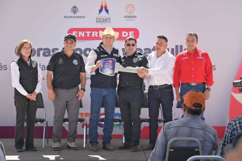 Villegas Villarreal detalló que tan solo en esta visita se entregan acciones por alrededor de 3 millones de pesos en San Luis del Cordero, entre ellas una patrulla para Seguridad Pública, uniformes, la colocación de pasto sintético en una cancha deportiva, la ampliación de la red de alcantarillado en la cabecera municipal, así como la rehabilitación de un pozo de agua potable y mejoras en infraestructura hidráulica en la comunidad de La Purísima.