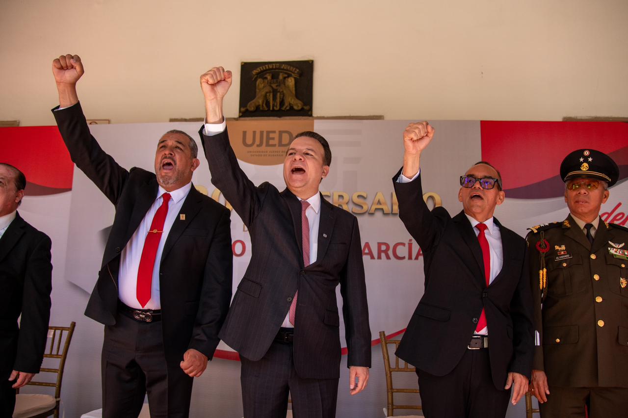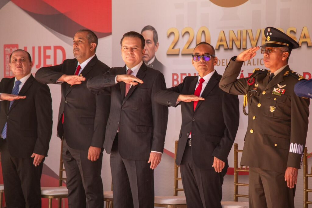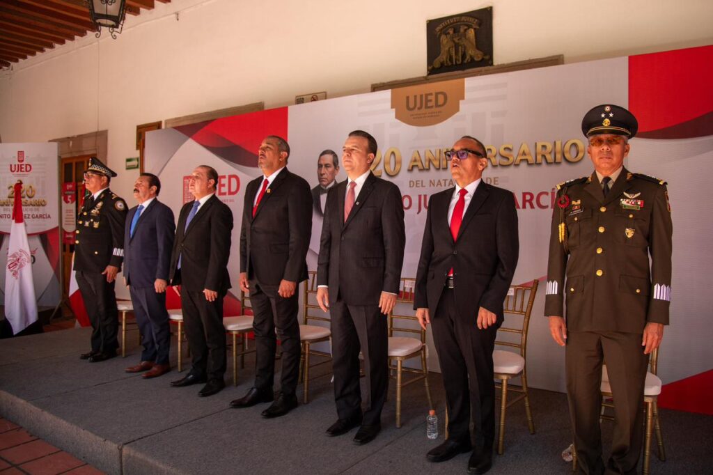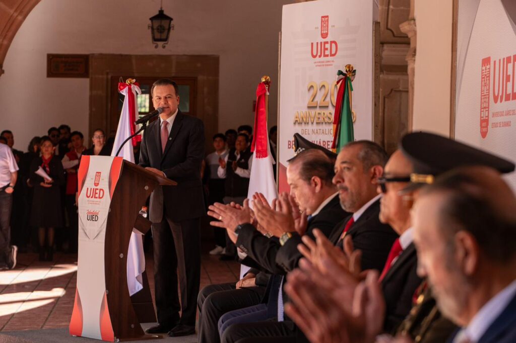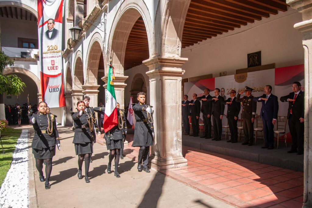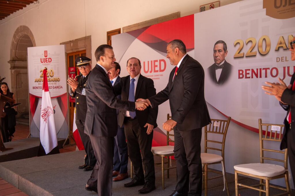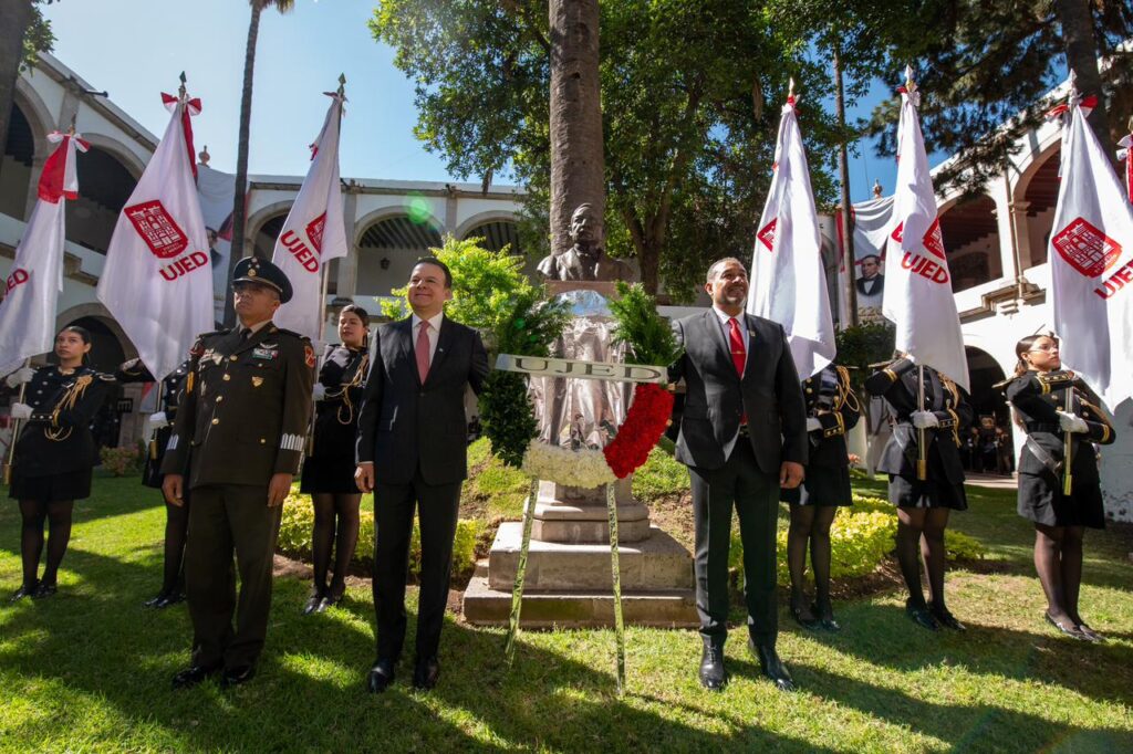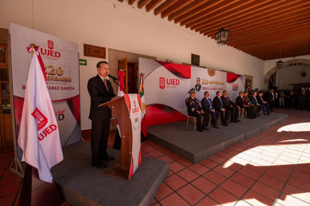 “De la mano de la UJED nace un gigante en Durango; aquí se forma el pensamiento y el futuro del estado”, aseguró el gobernador Esteban Villegas Villarreal durante la ceremonia conmemorativa por el 69 aniversario de la Universidad Juárez del Estado de Durango y el 220 aniversario del natalicio de Benito Juárez García, evento que encabezó junto al rector de la Universidad Juárez del Estado de Durango, Ramón García Rivera, en el Edificio Central, con la presencia de autoridades de los tres órdenes de gobierno y la comunidad universitaria.